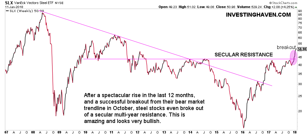 Steel stocks are in an amazing shape. Since they bottomed in January 2016 the steel stocks ETF SLX is up 3-fold. An index rising 3-fold in just 2 years is exceptional.
