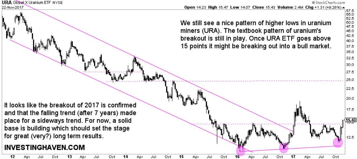 Let’s get this straight: a couple of months ago we identified 15 points in URA ETF (URA), the uranium miners stock, as the breakout level. Below is the chart with exactly the same annotations as published in this article in August: uranium miners building a solid base. We made a point that uranium could be trading sideways for a while, but it would be a solid base for a future bull market.