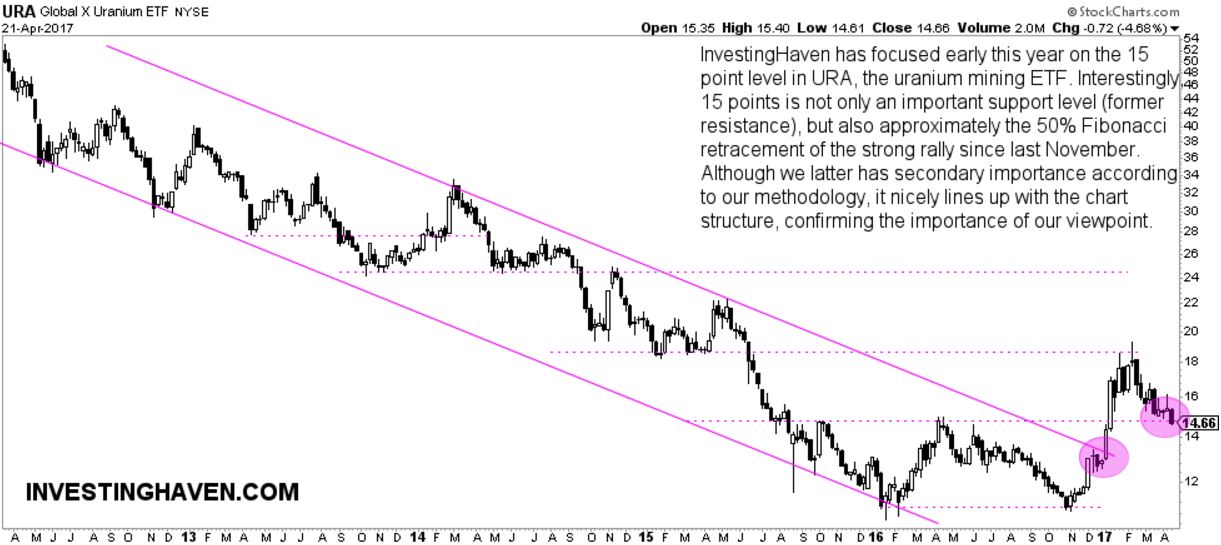 Interestingly, the importance of 15 points is not only visible in terms of URA’s chart structure it also has importance from a Fibonacci retracement point of view. According to InvestingHaven, Fibonacci retracments are certainly not a leading indicator, but it rather has a secondary importance (or even lower). In this case, however, the Fibonnaci retracement level has exactly the same outcome as our chart perspective. In other words, it is another confirmation, from a different angle, of the decisive value of 15 points in URA.