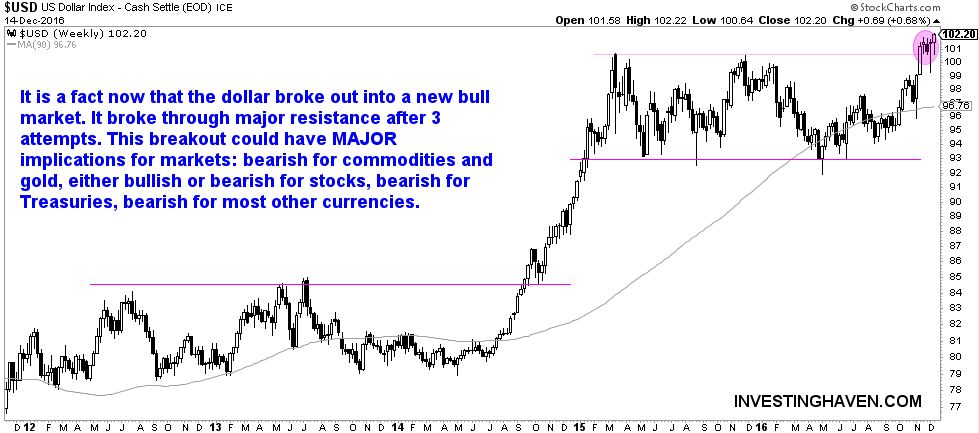 Investors should not underestimate the importance of this. To us, it menas that the dollar is now officially in a new bull market. After a consolidation of 2 years, it is now starting to move higher. In other words, this is the start of a new upleg.