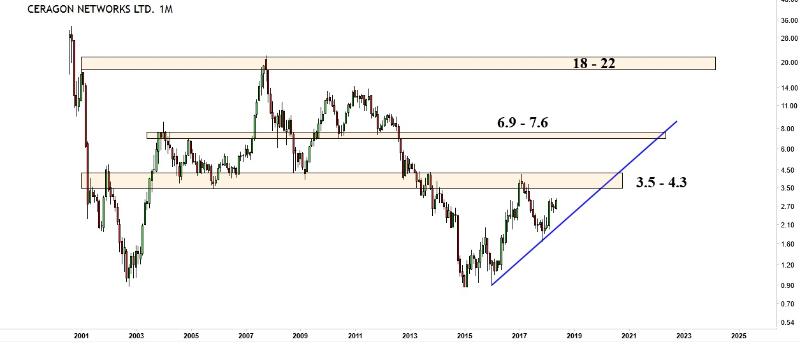 The monthly chart of CRNT shows that price had a potential W formation albeit somewhat skewed.