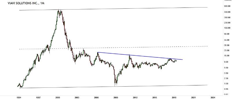 The monthly chart of Viavi shows a stellar price movement starting in 1994. This incredible move ultimately resulted in a collapse at the climax of 2000 dotcom bubble. By the time when 2008 financial market bottomed in 1st quarter of 2009, price of Viavi almost went back to where it started. For the past 9 years or so, price have been in consolidating range that is bound by the blue resistance line.
