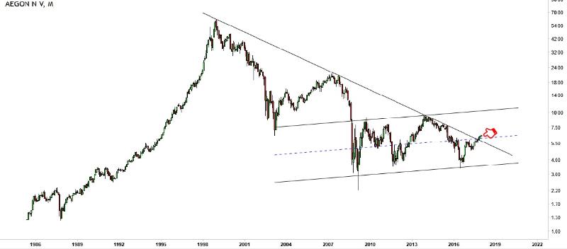 Aegon N.V. is a multinational life insurance, pensions and asset management company headquartered in The Hague, Netherlands. It is also listed in NYSE as an ADR stock. The monthly chart of Aegon posted above has an interesting multi decade downtrend since the stock topped in December 1988. For the last 29 years or so, price has been moving in a rock solid downtrend which was finally broken in November 2017. Our first price target for 2018 is around 9-10, and any price beyond it will be an exceptional bonus. The flipside is a break below 5.5, that would negate the upside projection. Insurance is an integral part of financial sector which will also benefit from growing economy.