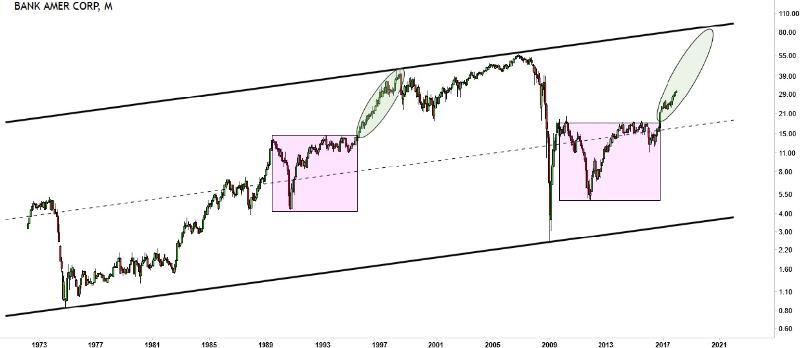 If the current price recognition is true, there could be a repeat of what happened in the 1990. Price had a consolidation in the pink box, upon breaking up, it goes at 45 degree angle (strongest bull market strength) that finally got saturated in the dotcom bubble in year 2000. Base on this argument, the current price could be on its way to ~80 before a significant correction could materialize. As for 2018, the projected target is ~40. On the contrary, if price does retrace, 25 dollar zone is particularly important.