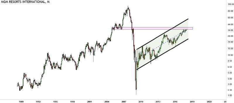 Monthly chart of MGM shows that price will be heading into a major cross road at 34.80 – 38.50, either it breaks directly with not much resistance or multiple weeks of consolidation before clearing this hurdle. If that is the case, the upside target will be ~47 in 2018 followed by ~56 in 2019. Should the resistance rejects, price could swiftly retraced back to ~31