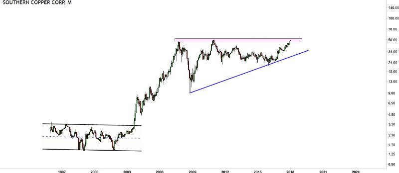 This fundamental scenario is in total congruent with the monthly chart of SCCO below. Since the last global financial crisis, price has consolidated in the past ten years forming a massive ascending triangle. Price is attempting to break 49.5 again. Should this third attempt become successful, the upside target will be ~62 while immediate downside support will be ~43