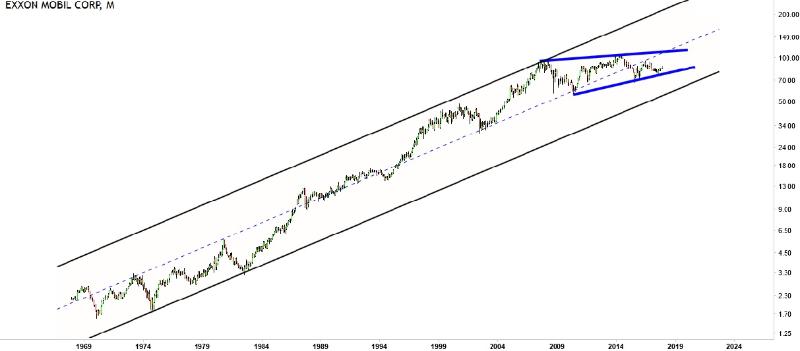 The monthly chart of XOM has a long term uptrend channel where price fits nicely. Since the meltdown of price in 2008 at the top of channel back to median line, price has been consolidating in the triangle (bound by dark blue line). Instead of over projection, we will keep our bullish target at ~94 by 2018 and subsequently ~110 by 2019, that’s provided price has an overall upward move. There is a small risk of price retracing by to ~82 in case correction happens.
