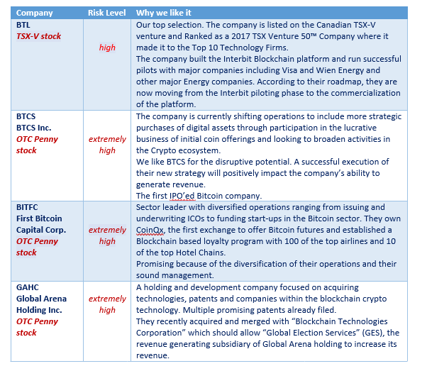 Other than the penny or small cap stocks there are of course also existing large of mid caps developing crypto and blockchain applications. Think of the IBM’s of this world. The fact that those companies are spending time, money, effort in blockchain is the ultimate confirmation that the technology is here to stay !