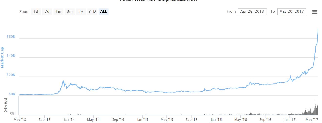 All cryptocurrencies combined have a market cap of more than $60B meantime. So that includes all cryptocurrencies in existence: Bitcoin, Ethereum, Ripple (XRP), Litecoin, and hundreds of smaller and unknown ones.