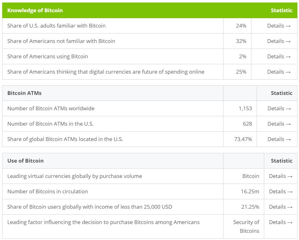 According to Statista, who has dedicated a section to cryptocurrencies useful for investing, we see that the number of adults in the U.S. familiar with the most known cryptocurrency (Bitcoin) is only 24 percent. And, by far the most important data point on this graph, the number of Americans that use Bitcoin is 2 percent while the ones thinking of using it in the future is 25 percent.