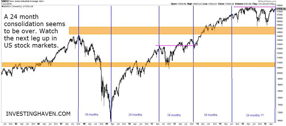 Moreover, and even more interesting, is the timing aspect. We are all familiar with the 18 to 24 month cycles. U.S. stocks are about to spend 24 months in a consolidation period, and, right at the end of that period, they are set to break out. As seen on the chart below, 18 to 24 month cycles have coincided with uptrends, downtrends or consolidation periods. It seems that the current consolidation cycle is about to end, and a new uptrend is about to start.