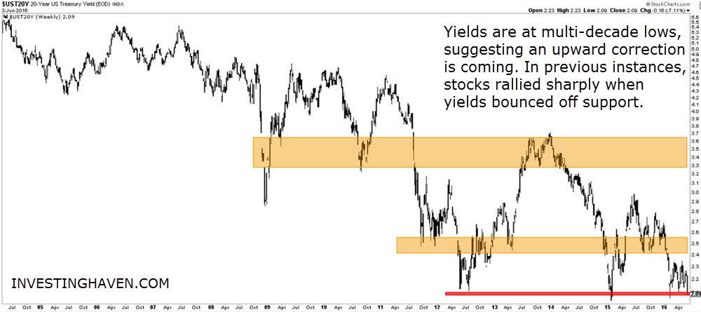 The other scenario is that yields would bounce off support, similar to 2012 and early 2015. That would trigger a ‘risk on’ sentiment among investors, sending stocks much higher. We believe there is a 90% probability that this scenario will play out, based on our risk indicators which are becoming increasingly bullish.