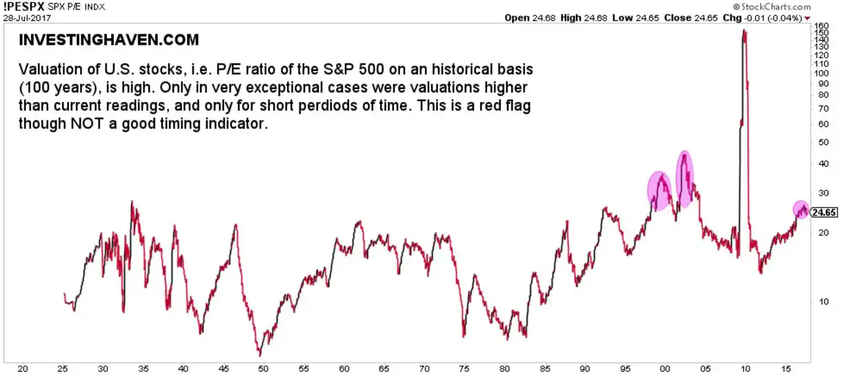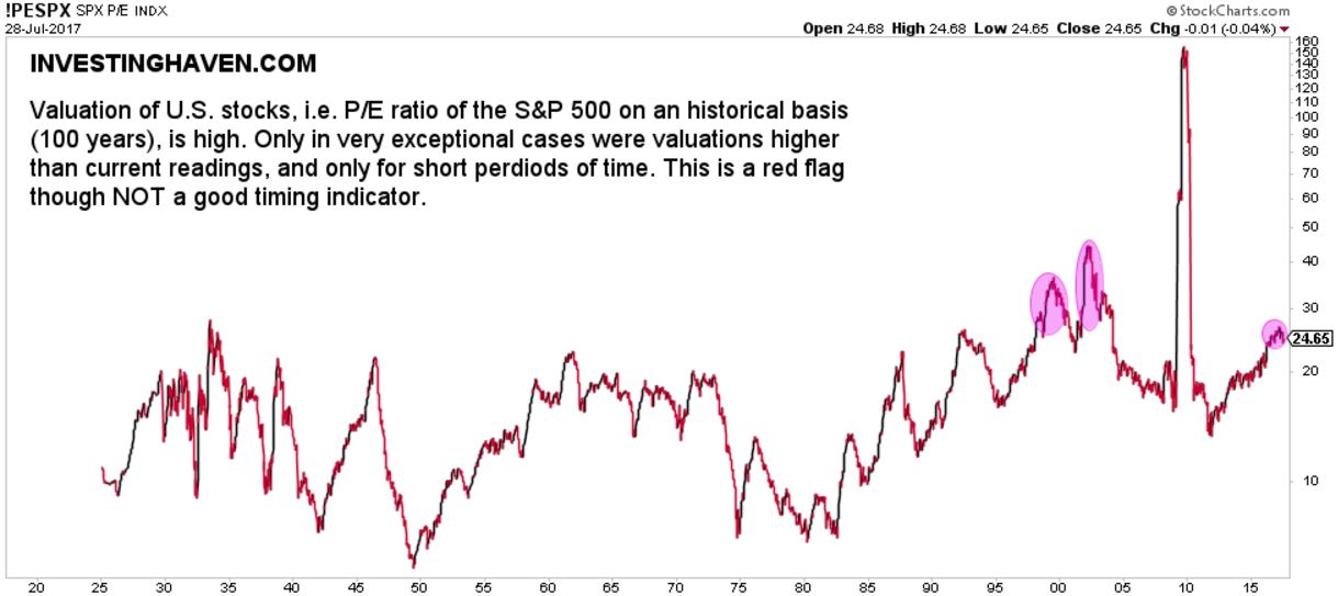 The P/E index of the S&P 500 on 100 years shows that this is the 3d highest reading ever. This is a valuation metric so more fundamental in nature. Note how only a handful of times in the last 100 years similar readings were reached, and they coincided with major stock market peaks.