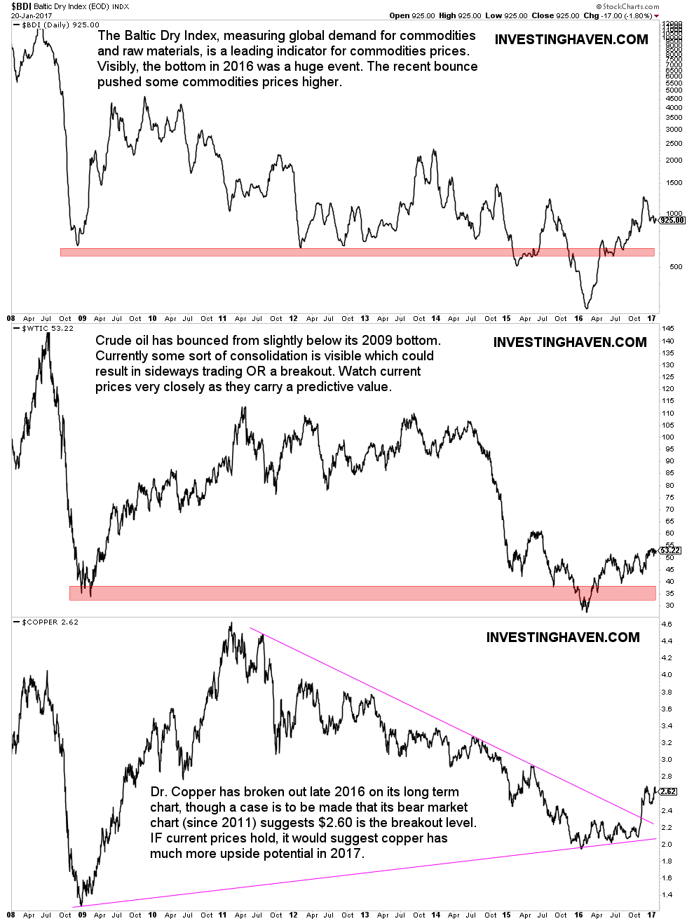 Below chart visualizes the Baltic Dry Index, crude oil and copper. Visibly, copper has a more constructive setup at this point. In other words, with the recovery of the Baltic Dry Index, the copper market is set to profit most of it. Stock market investors should watch copper stocks very closely in 2017 as a potentially very profitable stock market trend.