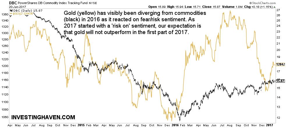 Last year, gold and commodities clearly diverged from each other. The challenge with gold forecasting is that gold has several faces, which makes it very hard to read the gold market. Gold can definitely move as a commodity, similar to the 2002 – 2007 boom, but it can also rise on fear/panic in markets.