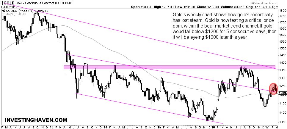 A rising dollar is mostly bearish for gold. That is in line with what we wrote in Dollar Continues Bull Market: Bullish for Yields but Bearish for Gold. No surprise there. Right now, gold could be violating an important trend line. If $1210 gives away, which seems to be happening right now, we see gold moving sharply lower until the summer of this year.