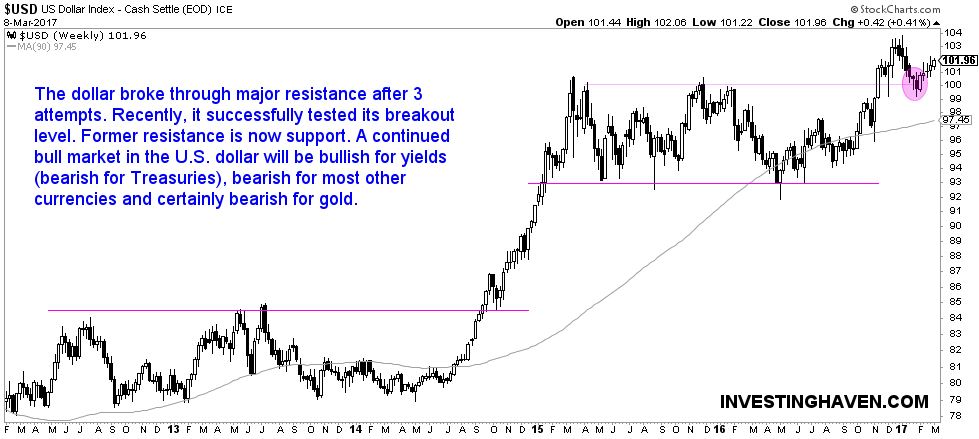 As yields rise, bonds become less attractive and the U.S. dollar becomes more attractive. The dollar chart clearly reflects this point, as seen on the next chart (see also the annotations).