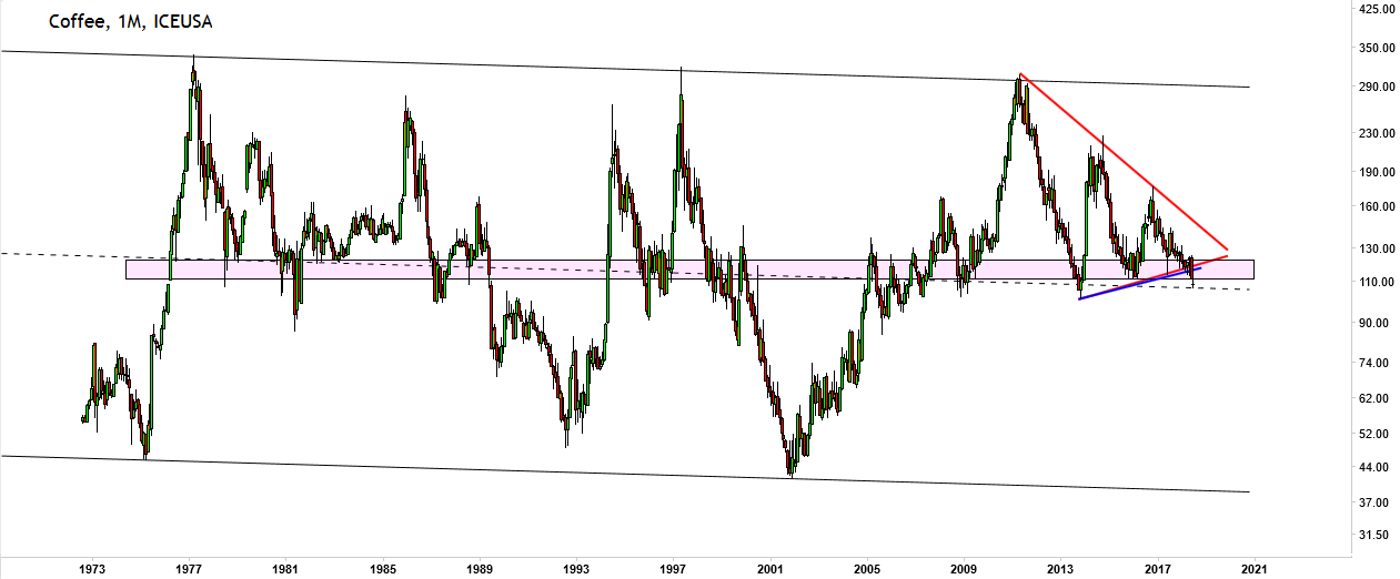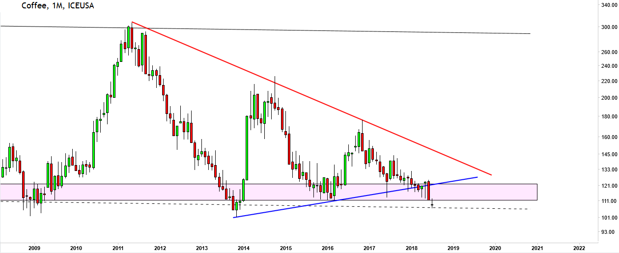 Coffee futures are also trading at multi-decade support, and have even broken down from the series of higher lows which started in 2013: