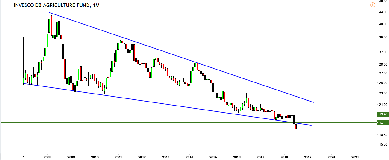 Within the agricultural commodities space we see a couple of important observations, and we focus first on the leading ETF in this space. This chart, and the patterns on there, largely determine the outlook for agricultural commodities in 2018 and beyond.