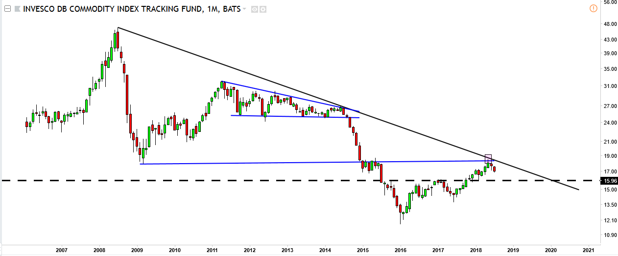 As seen on the first chart the commodities index got rejected last month right at a major breakout attempt.
