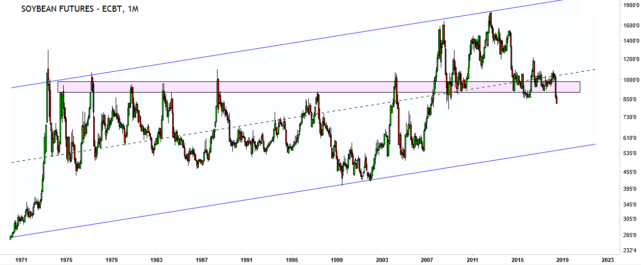 Soybean futures are falling through multi-decade support: