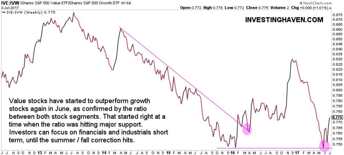 We have told readers many times that ratios should not be a primary indicator and should certainly not lead any investment. There are some exceptions, and one of them is the value stocks to growth stocks ratio. Again, this ratio should not be read in isolation, but, interestingly, is gets confirmed by other indicators.