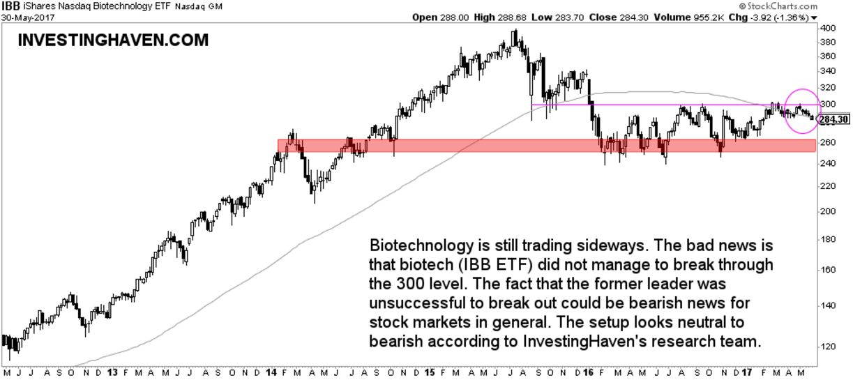 The biotechnology stock market sector is starting to behave as a laggard. There is no breakdown on biotechnology’s chart (yet) but we observe the first signs of a lagging behavior.