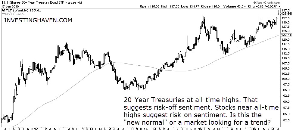 We observe odd trends in the market, the most important one being Treasuries and stocks both trading near all-time highs. That is definitely not ‘normal’ (whatever that term means nowadays), as bonds stand for ‘risk off’ (a safe haven asset) while stocks are only performing in a ‘risk on’ environment.