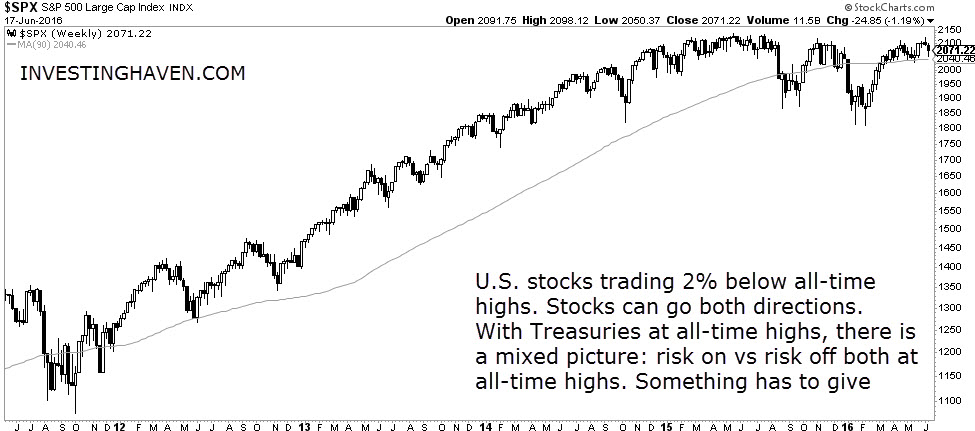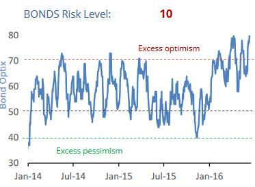 The market is giving a very strange message: both ‘risk on’ and ‘risk off’ assets seem to be in favor. However, when looking in more detail, it seems that markets are looking for direction. That does not suggest a doomsday scenario. Based on the bond optimism index, we believe that bonds are extremely overbought. As the bonds to stocks ratio is at a decision point, the odds favor a correction of bond markets, which would send stocks considerably higher in 2016.
