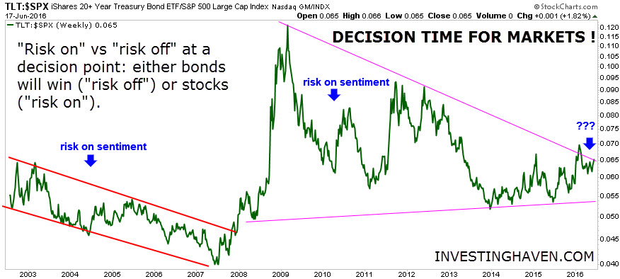 We believe the latter is the case, and we also believe we will get an answer very, very soon. Our belief is based on intermarket analyis, i.e. the bonds to stocks ratio (chart below). The ratio suggests that markets arrived at a critical juncture. It is decision time, right here right now.