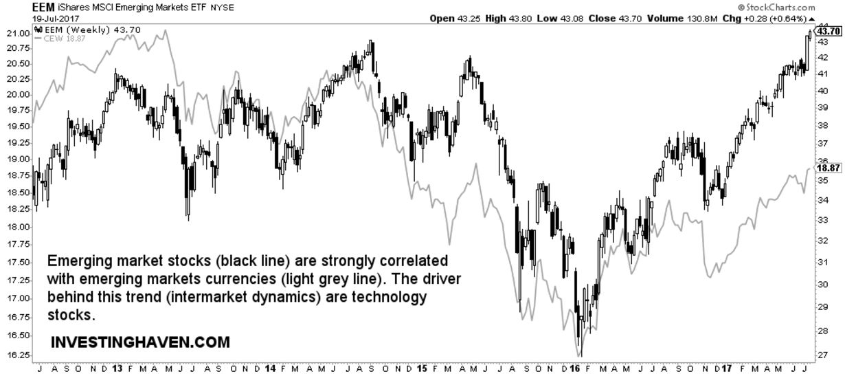 Interestingly, emerging markets stocks and currencies are rising together. Emerging currencies and stocks generally trend in the same direction. The chart shows that both bottomed together early last year 2016 and started rising together.