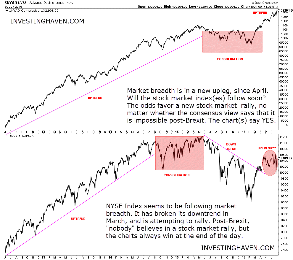 First, the NYSE advance minus decline issues since 2012 signaled a strong stock market rally already back in April of 2016. The upper pane of the following chart makes that point. It really does not matter what event is taking place, Brexit or not, the stock market trend started 3 months ago, and a Brexit is not able to stop such a trend, simple as that.