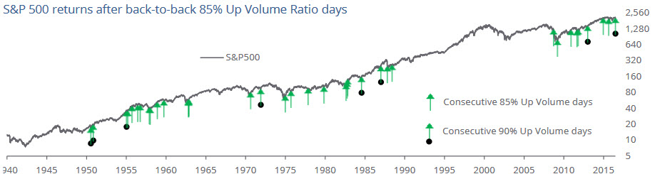 There is even more evidence of a coming stock market rally. The next chart, courtesy of Sentimentrader, goes even back 60 years! It also shows market internals. Wednesday was a day with 90% Up Volume. The last time NYSE volume was so heavily focused on advancing stocks on consecutive days was in January 2013 and there haven’t been many occurrences besides that. All of them were bullish for the medium-term. Even if we relax the parameters, medium-term returns in the S&P 500 going forward were exceptional.