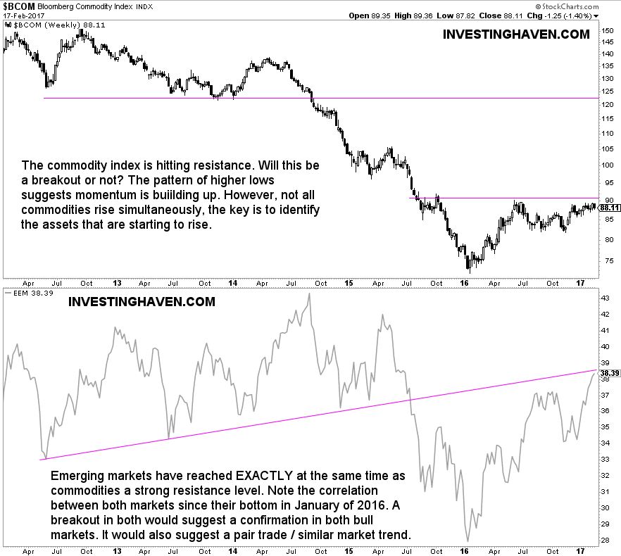 Back to the ongoing market correlation between commodities and emerging markets. Since last year, both markets are highly correlated, as evidenced by below chart. The more important observation, however, is the fact that both markets simultaneously are trading at a major price level: