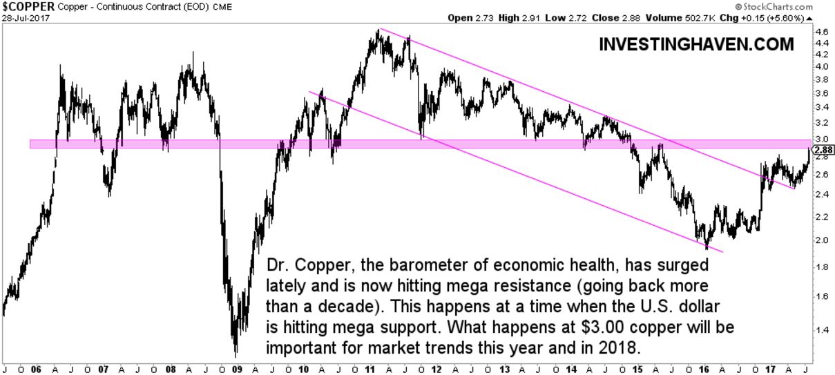 Last but not least, Dr. Copper is hitting major resistance, going back more than a decade. That happens right at a time when the dollar hits major support. If the dollar falls, it would be inflationary, and both gold and copper would break above their mega resistance. The opposite it true as well. That is, in a nutsell, the commodities story of 2018.