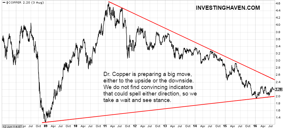We do not see many indicators which could forecast the direction of copper’s upcoming move. What we do know, however, is that copper tends to move extremely sharp (not visible on below chart, though, but clearly visible on a secular chart over the last 4 decades), and that there is some room to the downside until the $1.70 area connecting the highs of 1980 and 1990 (not visible on the chart neither).