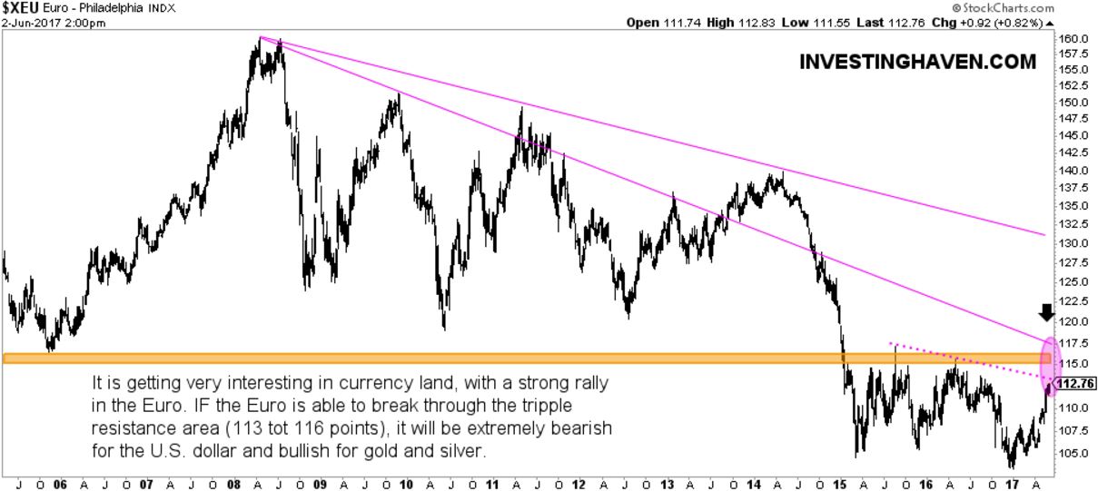Smart investors are watching closely both the Euro and gold chart to get a sense of the next big moves in currency land and in gold for the remainder of 2017.