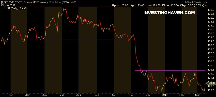 Bond prices went higher as well, but, as said, that is not consistent with rising stock prices. As long as bonds remain below the purple horizontal line visible on below chart, they are in a consolidation area, or, worst case, a tactical bear market. Time will tell, but, so far, there is no trend change in the bond market.
