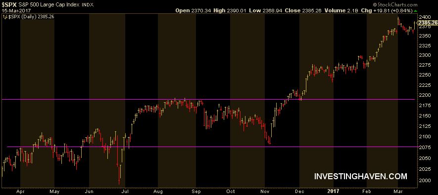 However, if there is a real winner after today’s interest rate hike, it clearly is one that went unnoticed: emerging stock markets. We explained today that it is official now: Emerging stock markets break out. The long term chart, also included below, shows the first sign of a breakout. The article which is linked has a very long term chart which highlights the importance of the 42 to 46 level in the emerging stock market ETF EEM. Watch closely what happens in emerging markets in the coming weeks.