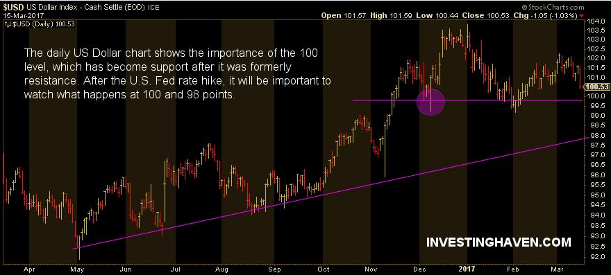 The dollar is by far the most interesting market. While the previous interest rate hike resulted in a breakout, which we documented in US Dollar Breaks Out To A New Bull Market, it seems that today’s reaction was different. Again, one day does not make a market, but weakness in the dollar is important right now as the dollar trades right at 100 points, a very significant price level.