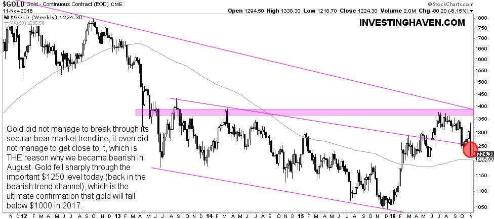 With that, we get the ultimate confirmation that gold is still in a longer term bear market, and that it is moving to the lower area of the channel which is below $1,000 /oz.