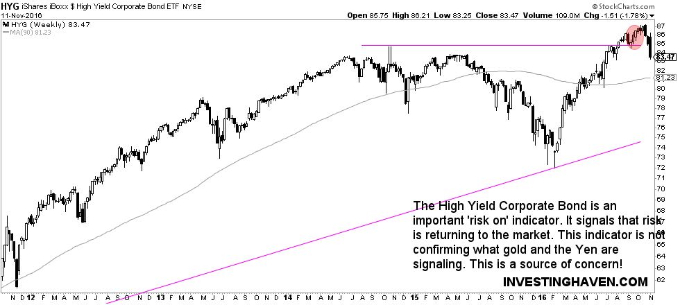 Though the Yen and the price of gold both confirm that the future gold price has a very bearish bias, there is one risk indicator which is not ‘convinced’ at this point, i.e. High Yield bonds (symbol HYG). The next chart makes that point. Investors should pay close attention at which point HYG stops falling.