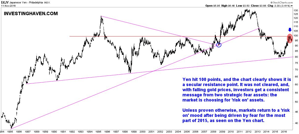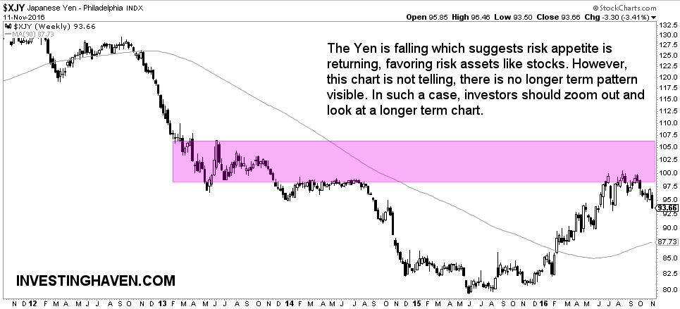 The Japanese Yen is said to be a global risk indicator, similar to gold. In recent weeks, the Yen has been falling steadily, after it rose sharply throughout 2015. What can we derive from that? The difficulty is that the weekly 5-year chart does not express any relevant pattern. In such a case, investors should zoom out until a relevant pattern becomes visible.