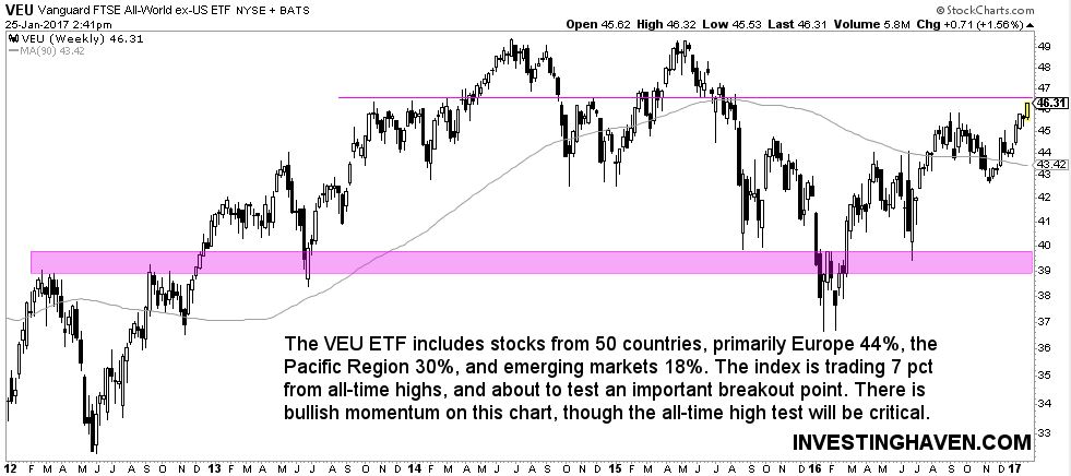 The ETF called Vanguard FTSE All-World ex-US (VEU) is trading at 18-month highs, and it just 7 percent below all-time highs. The VEU includes foreign stocks from 50 countries. Its biggest weightings are in Europe (44%), the Pacific Region (30%), and emerging markets (18%).