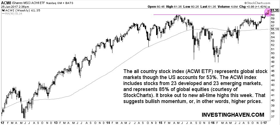 Global stock markets are performing remarkably. U.S. stock markets went 1 percent higher today, and leading indexes are trading at all-time highs (except for the Russell 2000 which is only 15 points from all-time highs). The Dow Jones Industrials broke through the psychologically important 20,000 points intra-day, an event widely followed by financial media worldwide (see Bloomberg, BBC and The Guardian among many others).