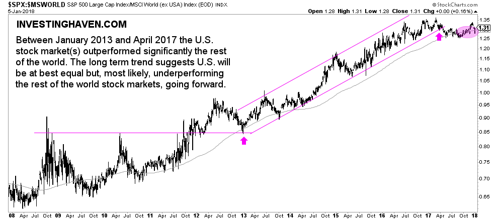 The uptrend between January 2013 and April 2017 indicated that U.S. stock markets were outperforming the rest of the world. With the ‘rest of the world’ readers should primarily think of European stock markets and emerging stock markets as that’s the lion’s share of it.