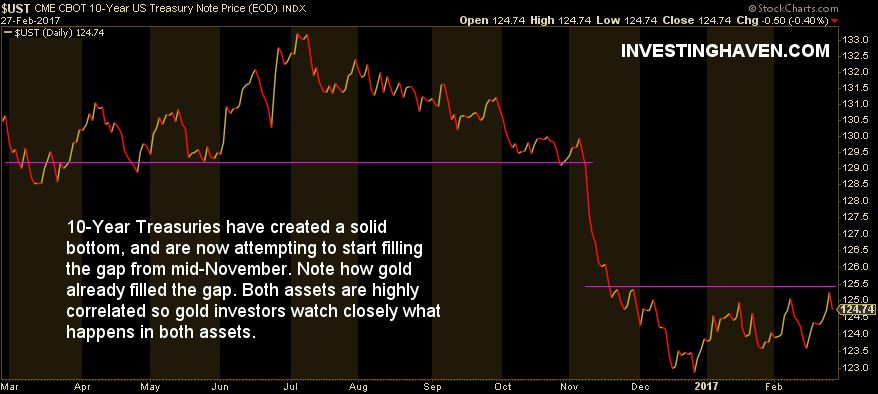 What that tells us is that March 2017 will be an important month for both gold and Treasuries. Moreover, the prices of both markets are at very important levels. Watch closely what gold does at $1250 to $1260, as well as 10-Year Treasury Notes at $125 to $129. It will carry predictive value for the coming months.