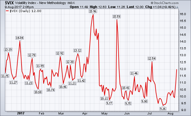 Measures of market volatility are bouncing. Not enough to signal any trend reversals, but enough to keep an eye on. The first chart shows the CBOE Volatility (VIX) index climbing 9% today to the highest level in a month. It would need to clear its early July peak at 12.54, however, to send a more negative warning.
