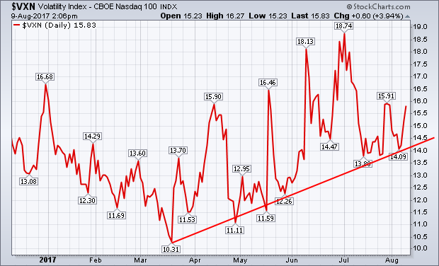 A little more concerning is the recent rise in the CBOE Nasdaq 100 Volatility Index ($VXN). [While the VIX is tied to the S&P 500, the VXN is tied to the 100 largest stocks in the technology-dominated Nasdaq market]. The second chart shows the VXN forming a pattern of rising peaks and troughs since March. That divergence between the two measures of volatility is unusual since they usually trend in the same direction. The divergence is also quite large.