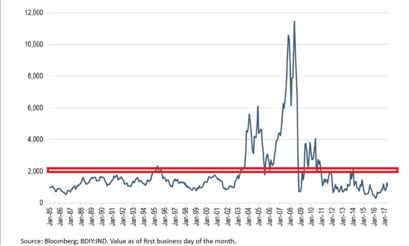 The Baltic Dry Index (BDI) is an economic indicator issued daily by the London-based Baltic Exchange. Not restricted to Baltic Sea countries the index provides “an assessment” of the price of carrying major raw materials around over sea. Taking in 23 shipping routes measured on a timecharter basis the index covers Handysize, Supramax, Panamax, and Capesize dry bulk carriers carrying a range of commodities including coal, iron ore, steel, cement, grains and so on around the world.